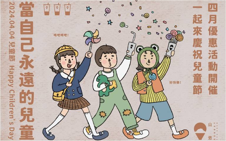 為了慶祝兒童節新品上市,4/4兒童節當日,山焙準備了1,000杯熟麥煎茶請你喝!全門店限前100名兒童(註:未滿12歲),只要出示身分證或健保卡,就能免費享用小杯的熟麥煎茶,享受專屬兒童的一天!
