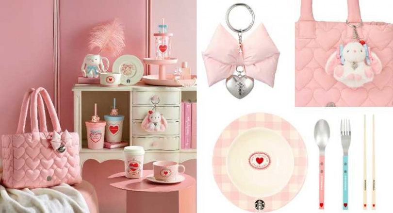 還有像是兔子、愛心吊飾,以及情人節限定愛心雲朵兩用包,可以把兔子吊飾掛在包包上更顯青春無敵,情人節限定的餐具(碗&餐具)組合也很吸睛,碗的邊緣是和保溫杯一樣的粉紅色格紋十分受到鐵粉喜愛。