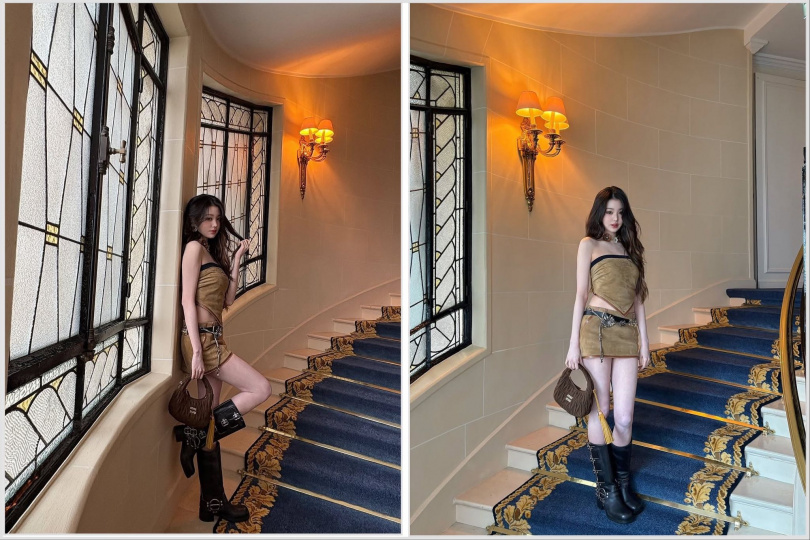 除了清新的學院風和簡約運動風,張員瑛還玩起了 美式復古甜酷風。這次她穿上 Miu Miu 棕色皮革抹胸+牛仔短裙,搭配 Miu Miu 黑色皮革機車風長靴和今年主打包款,打造又甜又颯的造型。這組穿搭一出,Threads 直接爆了,粉絲直呼:「這誰頂得住?!」