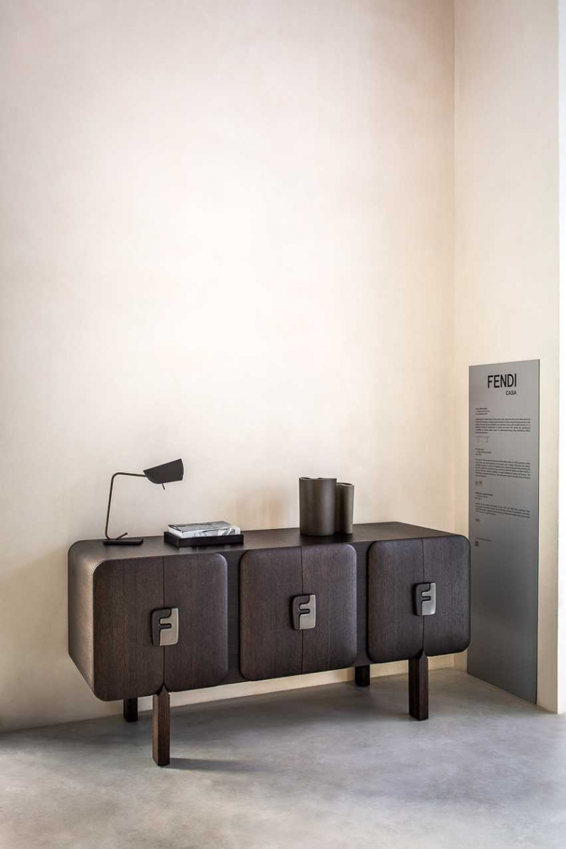 由 Peter Mabeo 設計的 Efo 櫥櫃反映出設計師招牌的獨特風格,以暖色或深色木料打造出原始、大方、圓潤的造型;FF LOGO 圖案裡的每一個 F 字母都成為櫃門的把手,關上後,透過開開關關的韻律互動重現 FF LOGO。