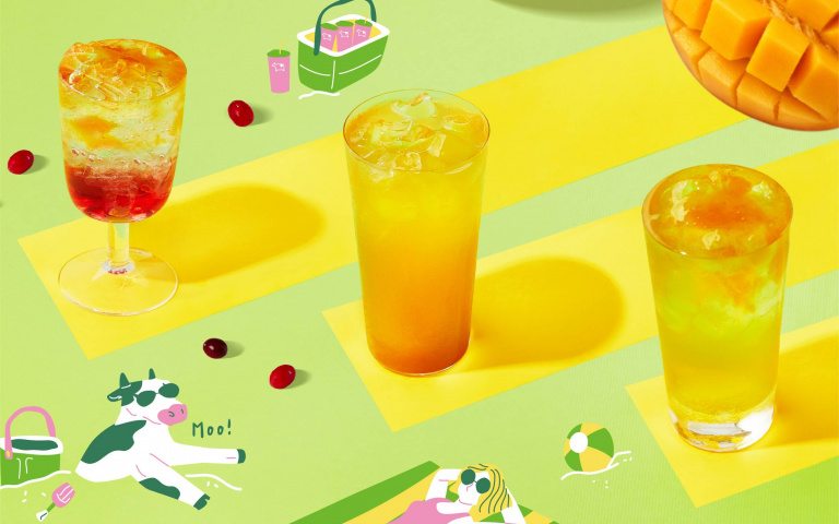 「海鹽芒果綠」巧妙融合檸檬清香、成熟芒果的甜美以及些許鹽味,喝下去仿佛漫步杜夢灣沙灘(65元)。「島嶼芒果青梅綠」則將芒果的甜與青梅的酸完美結合,尾韻有綠茶回甘(65元)。想要清爽氣泡感的則不能錯過「熱帶水果氣泡」,芒果、蜜桃、蔓越莓汁三重果香層次堆疊,搭配夢幻夕陽紅橙漸層,令人耳目一新(75元)。