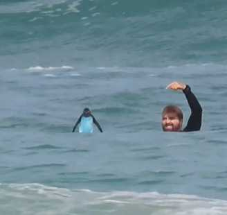 最近一段影片在網上曝光,可見一名男子當時正在南非開普敦的一處海域戲水衝浪,過程中一隻非洲企鵝決定和他一起玩,不僅主動站上衝浪板,還站得相當穩健,看起來就像是一名衝浪老手,而男子後來也說:「我們在開普敦的一次衝浪活動中與瀕臨滅絕的非洲企鵝進行了一次瘋狂的邂逅,這是我們永遠不會忘記的!」