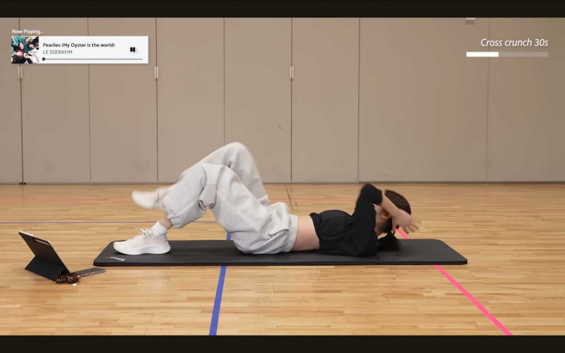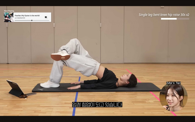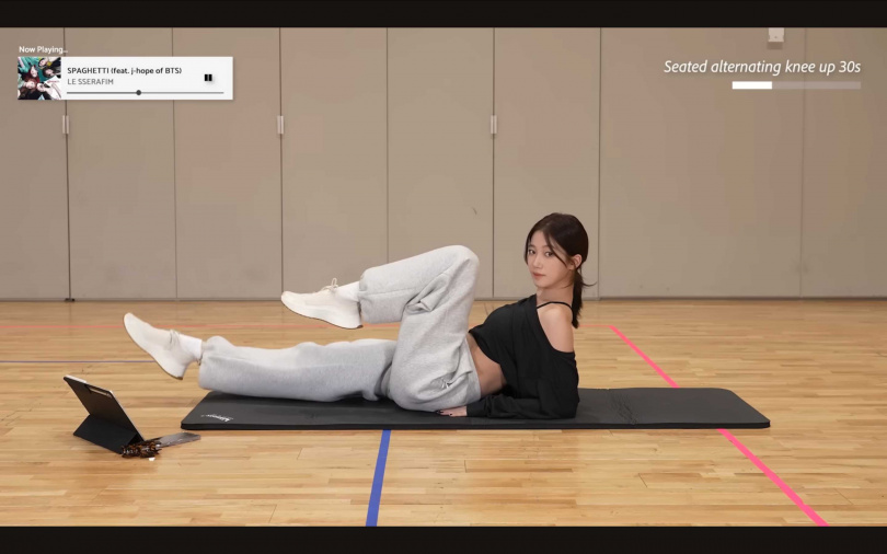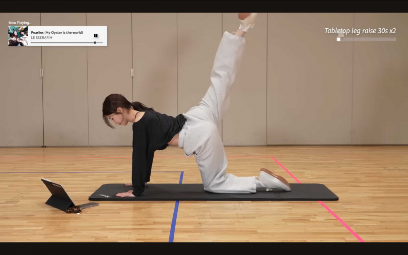 她的訓練重點以核心、臀腿線條與下腹緊實為主,每個動作都重複做30秒,強度不算輕,但很適合作為日常健身或居家鍛鍊。