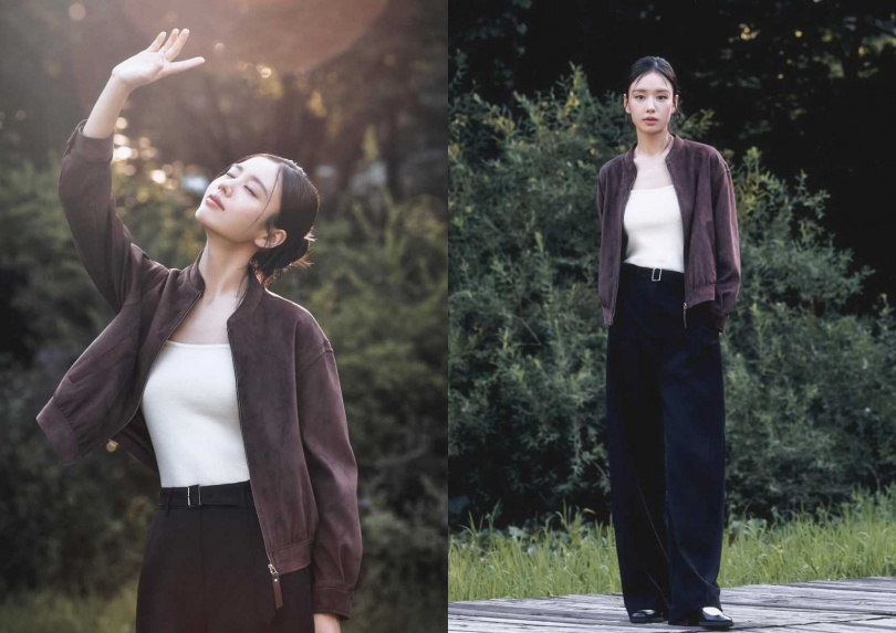 這套完全展現安恩真的小帥氣,深咖啡夾克讓整體有沉穩調性,內搭白色平口上衣小露鎖骨、增添女人味,最後用寬版黑色西裝褲把比例拉到最好。中性率性風是韓星最愛的小性感公式,寬版西裝褲讓腿又長又挺,秋冬就來一套帥氣路線的風格!
